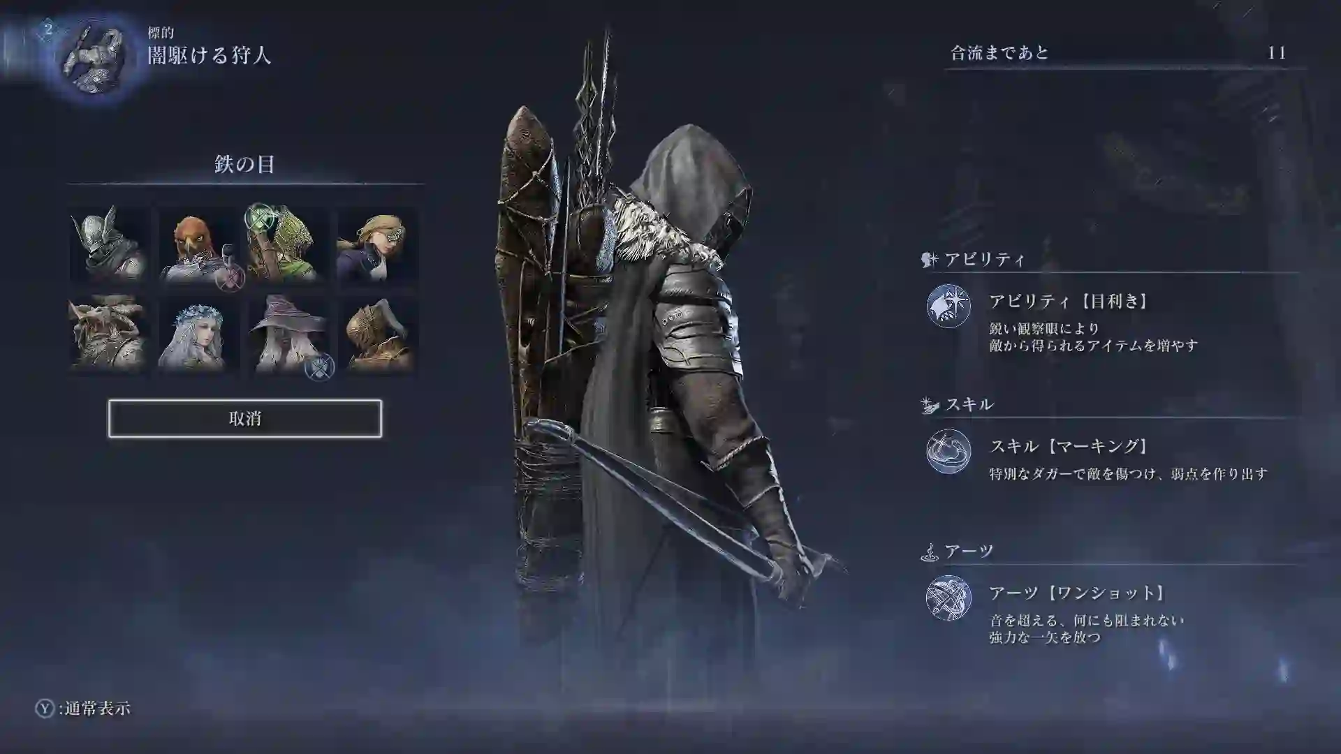 プレイヤーキャラも、左上から追跡者(オールマイティの戦士)、守護者(盾使うタンク)、鉄の目(弓使い)、レディ(短剣と魔法のテクニカルスピードキャラ)、無頼漢(脳筋戦士)、復讐者(祈祷と召喚師)、隠者(魔法使い)、執行者(技巧派侍)、と豊富です。