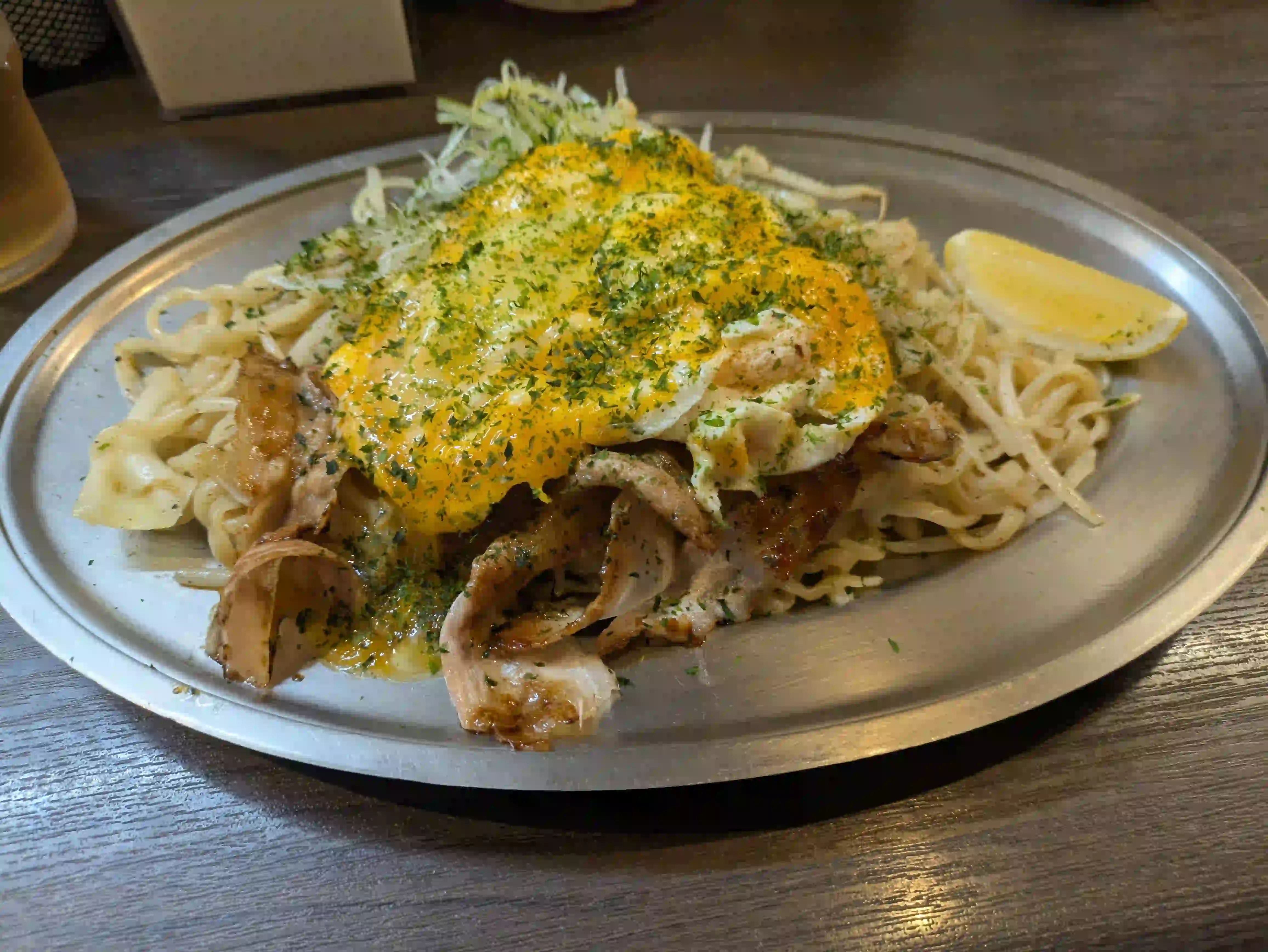 構成としては、豚バラ、もやし、キャベツに自家製麺、半熟気味の玉子焼きに、青のりになります。