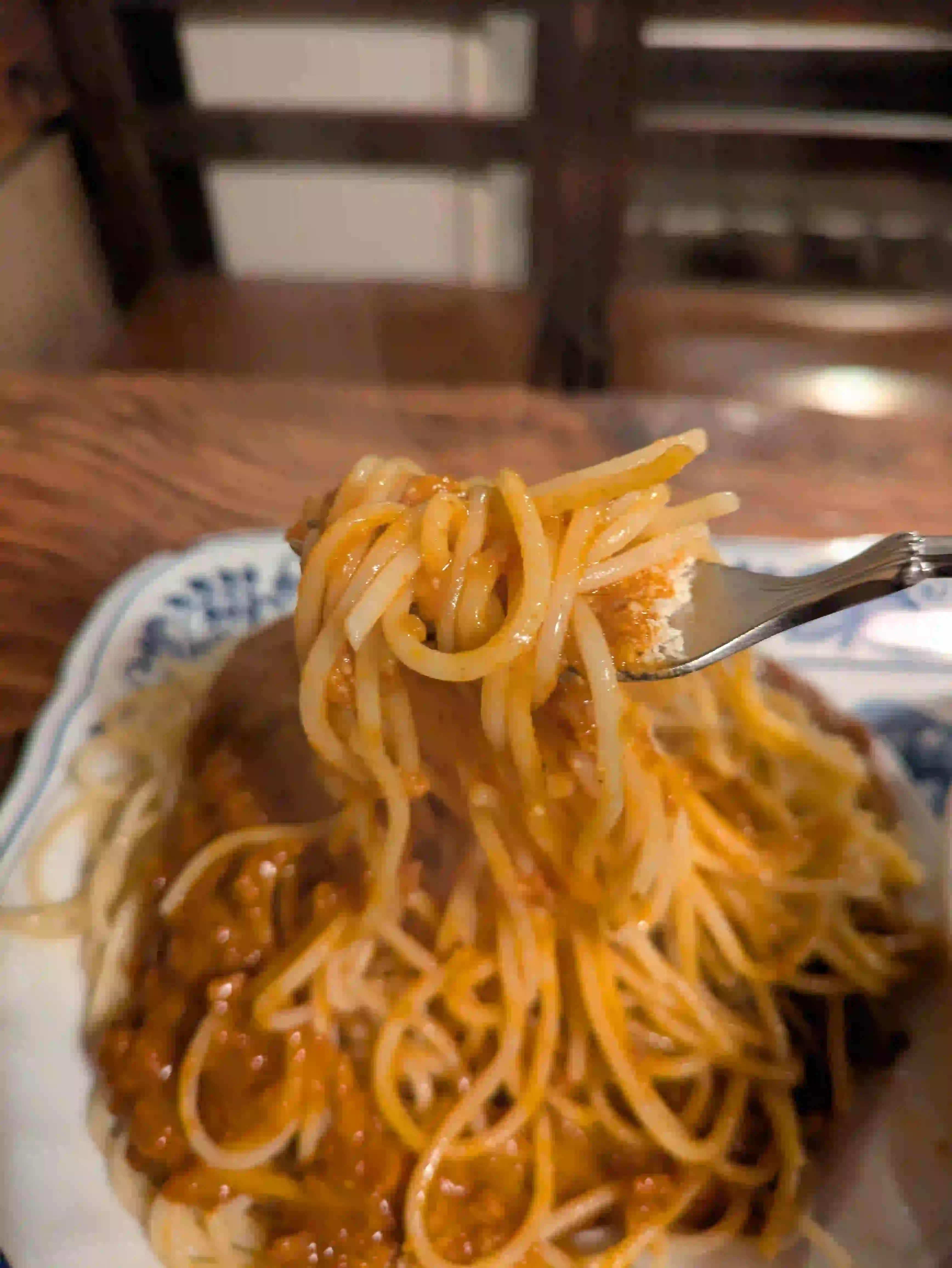 湯気がもうもうと出ているミートソースに粉チーズを振りかければ、もう最高ですね。