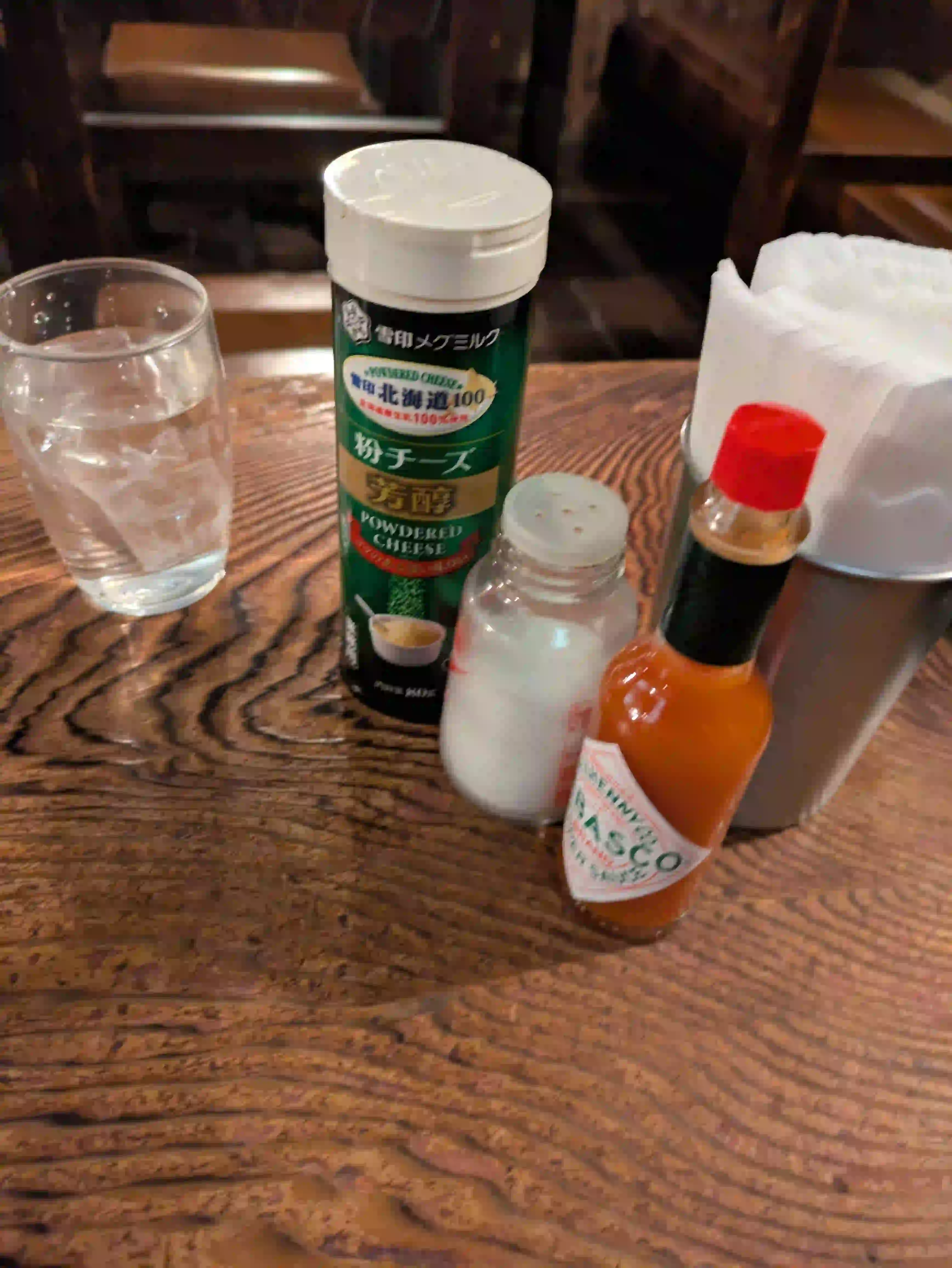 店内の調味料はタバスコ、塩、粉チーズと心強いセットですね。