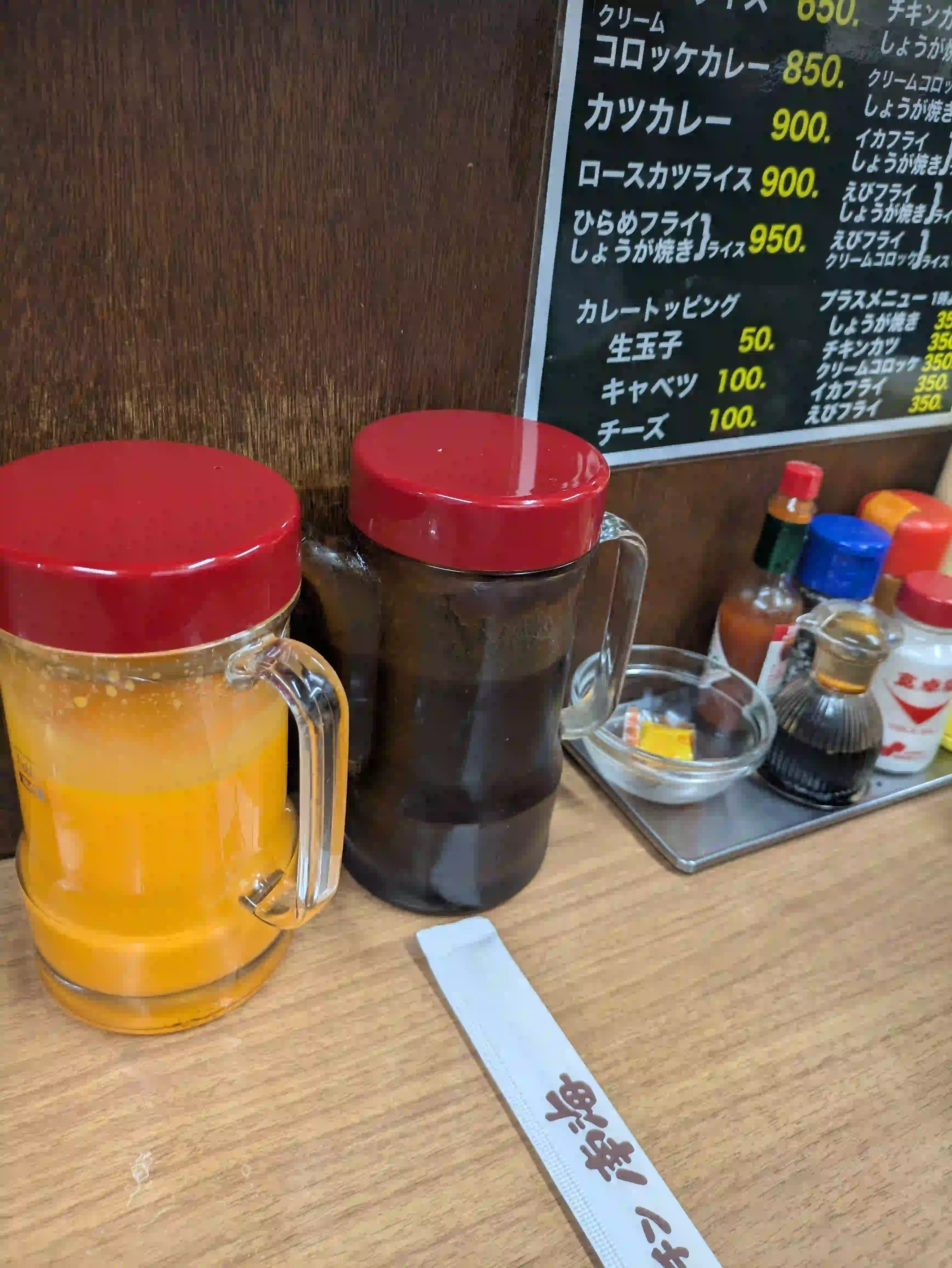 ソース、ごま塩(ご飯用)、塩、タバスコ、辛味スパイス、醤油、ここには写って無いのですが、マヨネーズ、福神漬けも置いてあります。