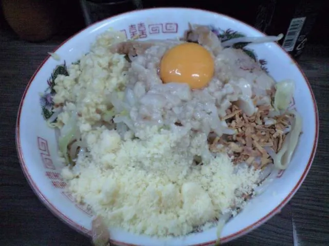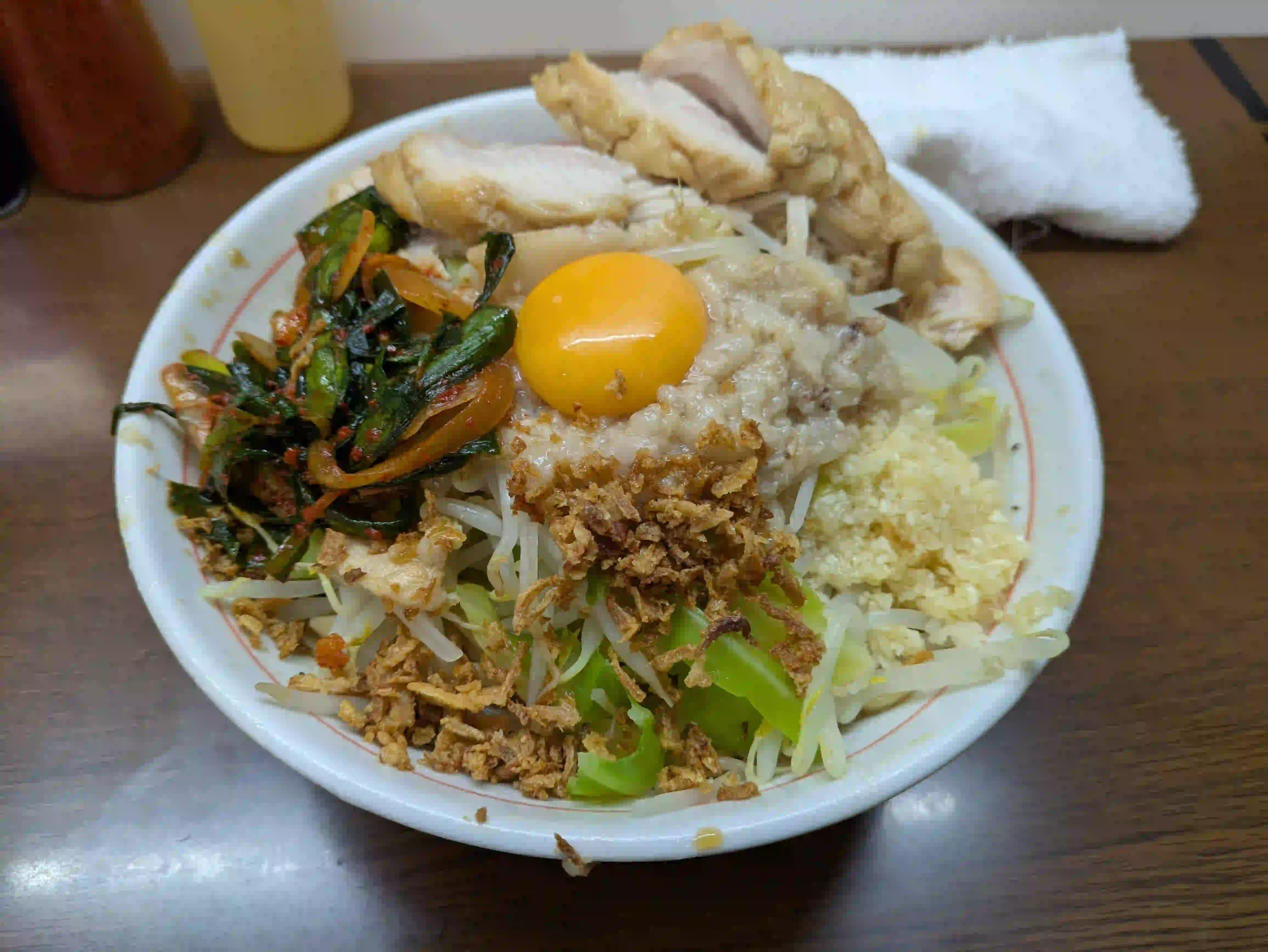 もちろん、スープ無しの「油そば」はもっとずっと以前から武蔵野エリアとかで販売しているのは知っているのですが、卵黄と脂でこってり感を足した二郎風の汁なしはこのお店から始まって、そのインスパイア店が全国に広がっていったと思います。