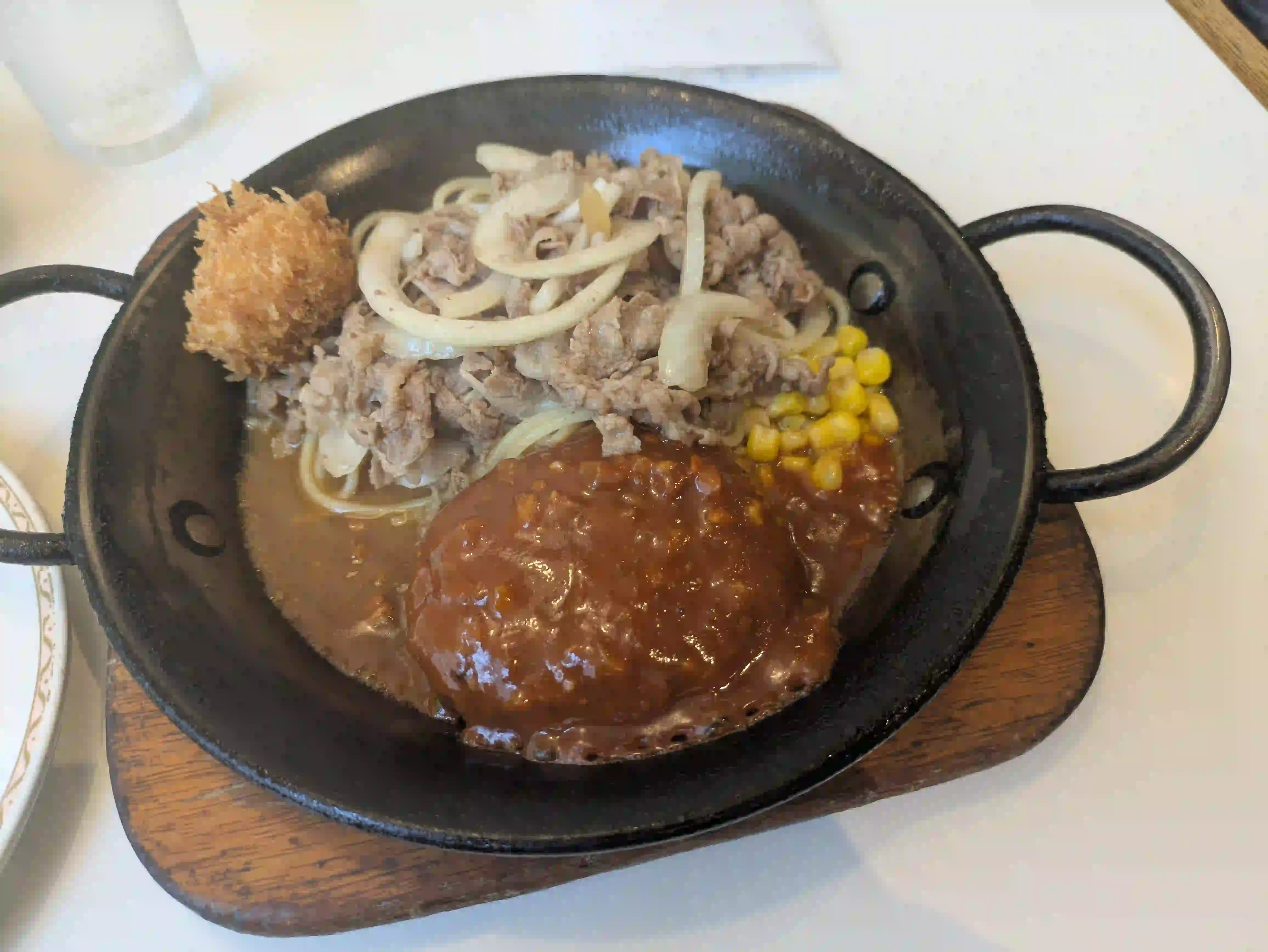 - ジャンボ鉄板焼(カロリー焼き、ハンバーグ、クリームコロッケ):1080円